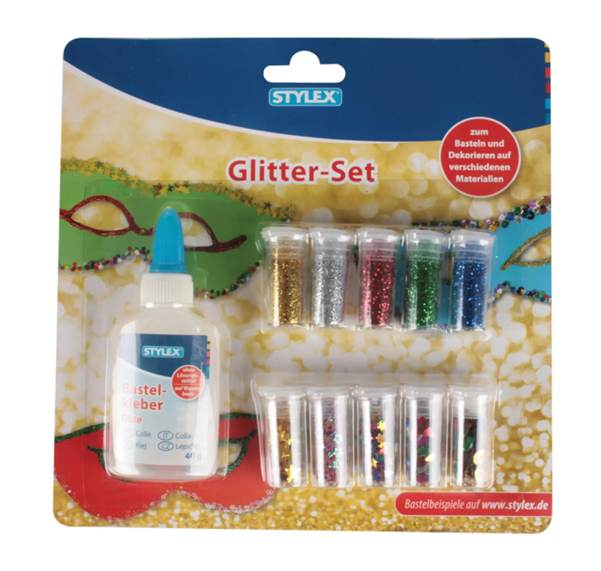 | Im Paket | 1 × Bastelkleber, 5 × Döschen Streudeko, 5 × Döschen Glitterpulver |