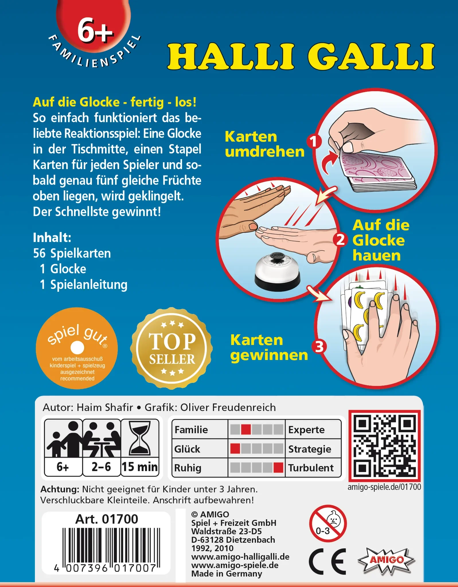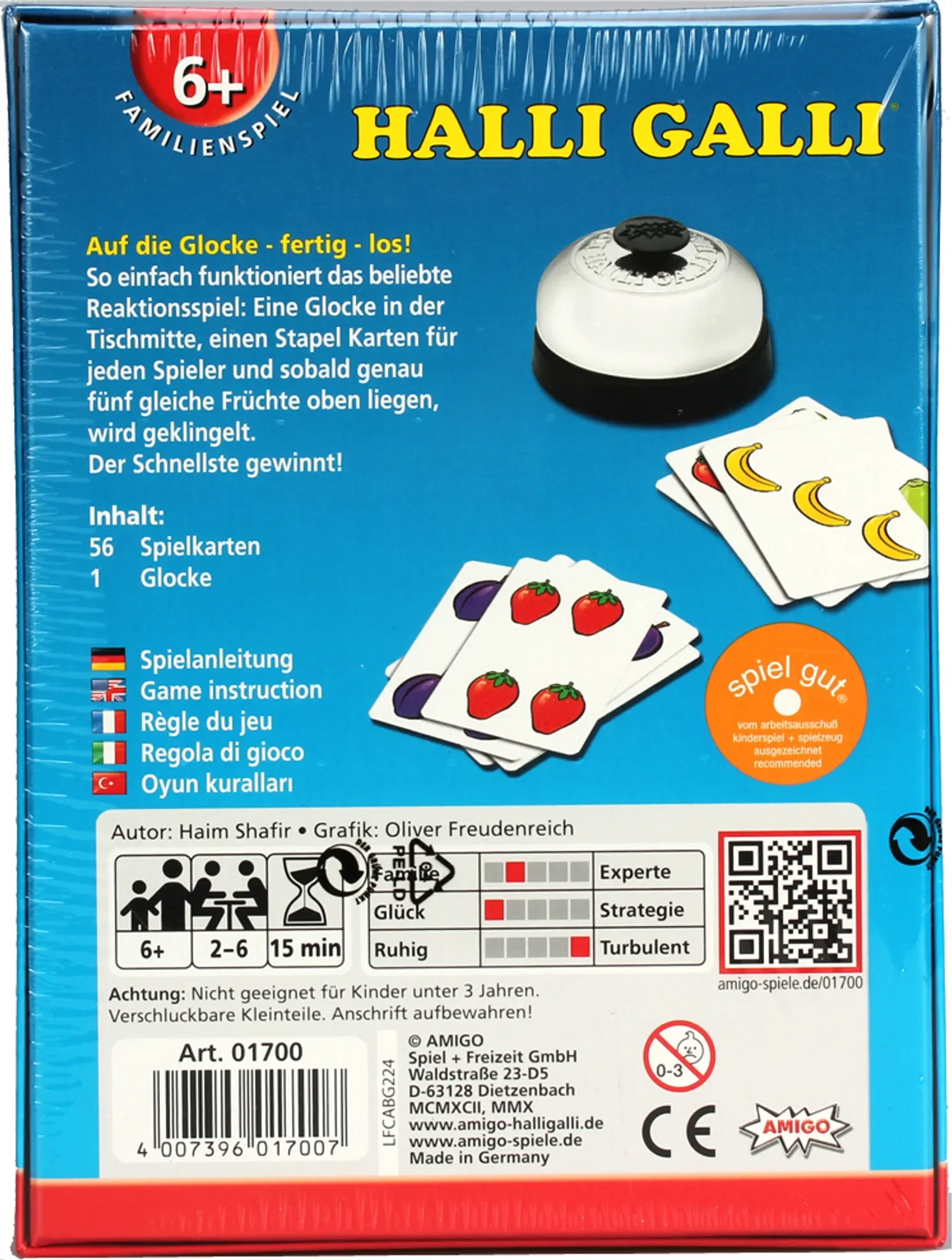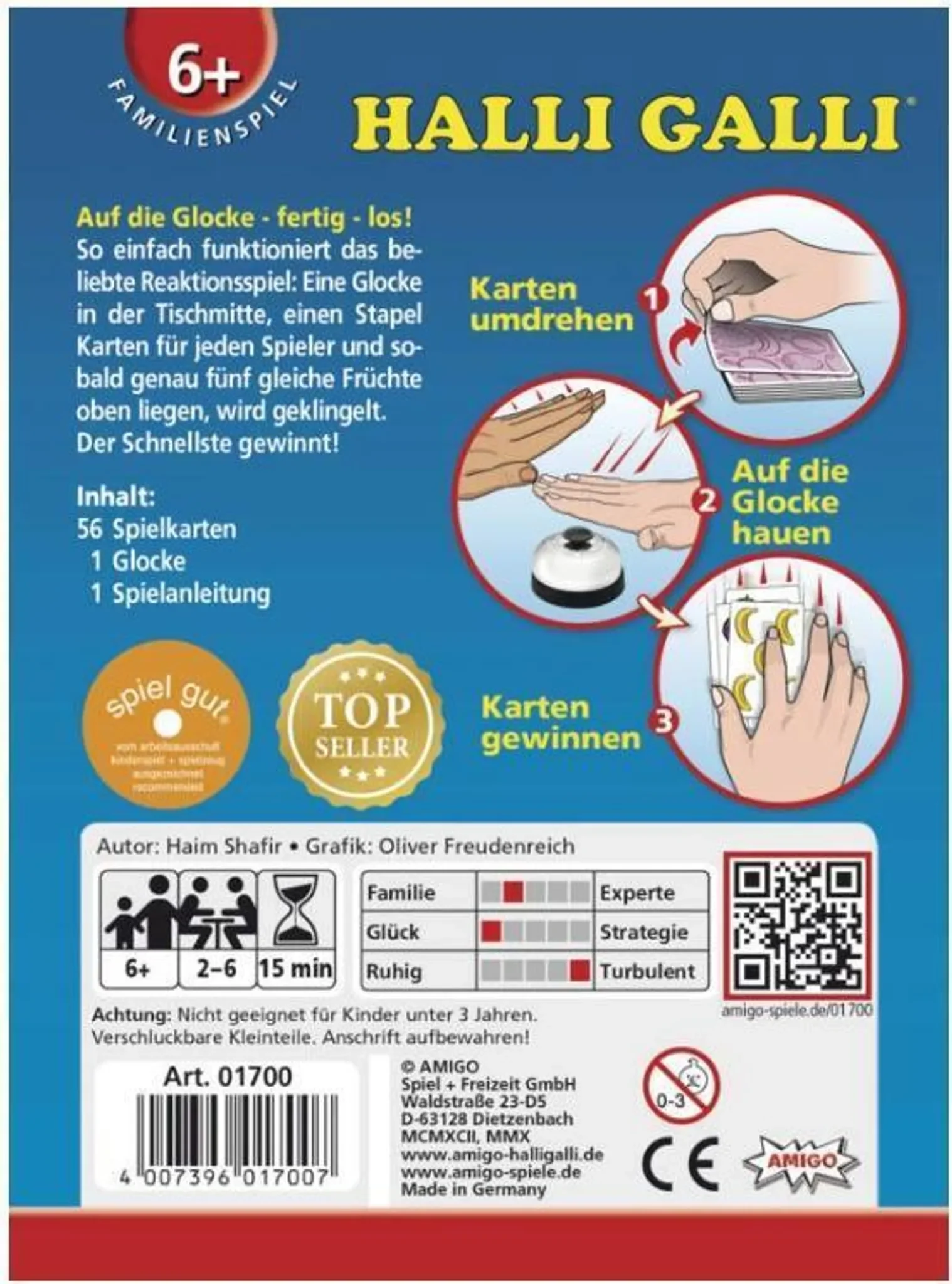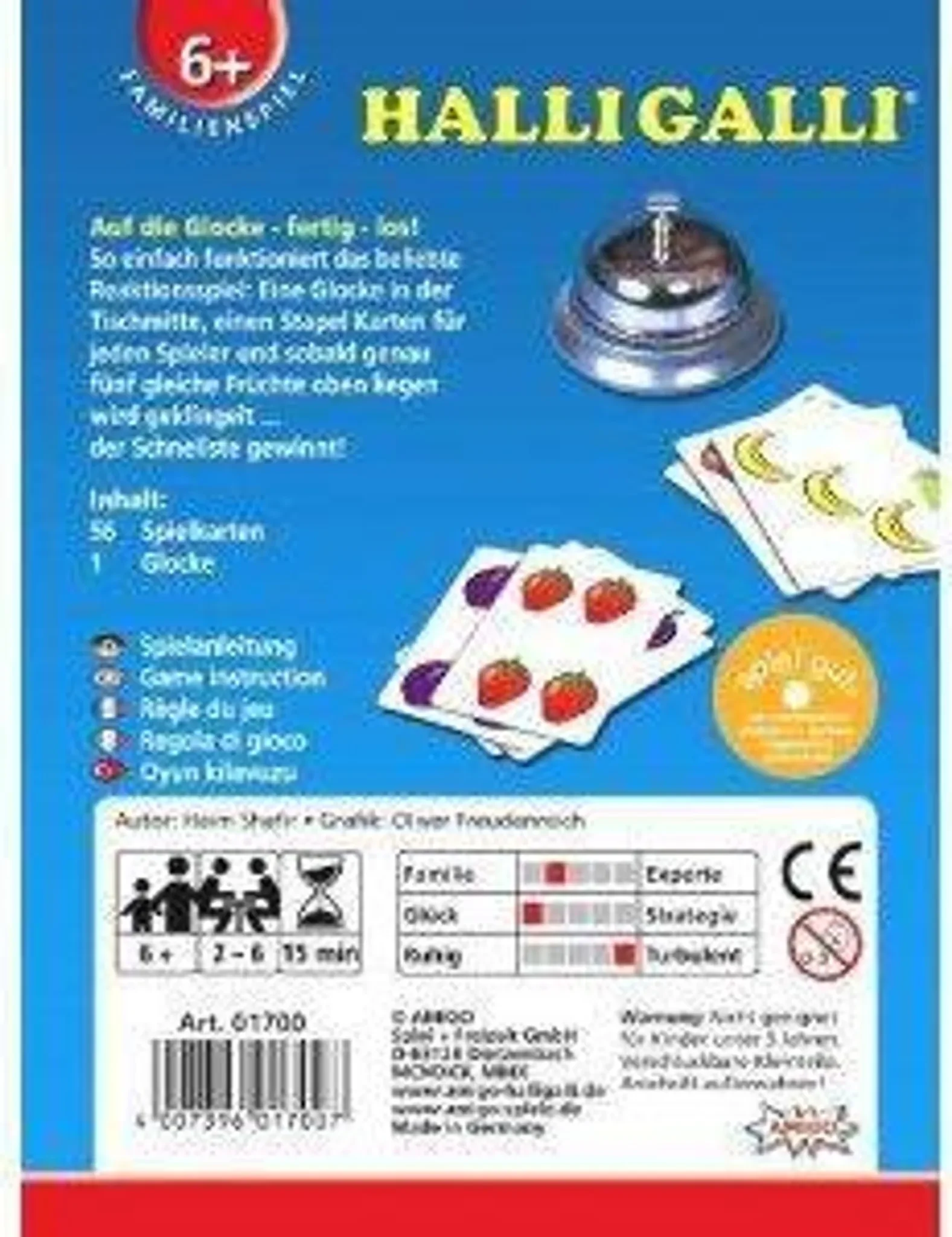 Wer zuerst klingelt, gewinnt die ausliegenden Karten – doch Vorsicht: Ein Fehlgriff wird bestraft. Dank einfacher Regeln, kurzer Spieldauer und hohem Spaßfaktor eignet sich Halli Galli ideal für Familienabende, Partys oder eine schnelle Runde zwischendurch.