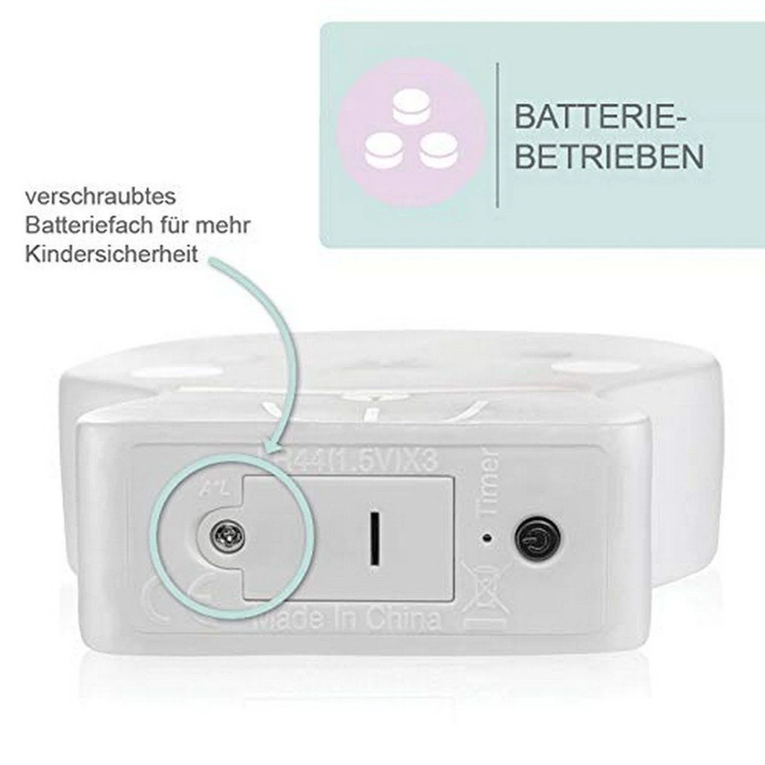 Die praktische Timer-Funktion schaltet das Licht nach 15 Minuten automatisch aus und spart so Energie. Das batteriebetriebene Design vermeidet Kabel und sorgt für eine sichere Nutzung ohne Stolpergefahr. Das Nachtlicht ist aus abwaschbarem Kunststoff gefertigt, was die Pflege erleichtert und eine lange Haltbarkeit garantiert.