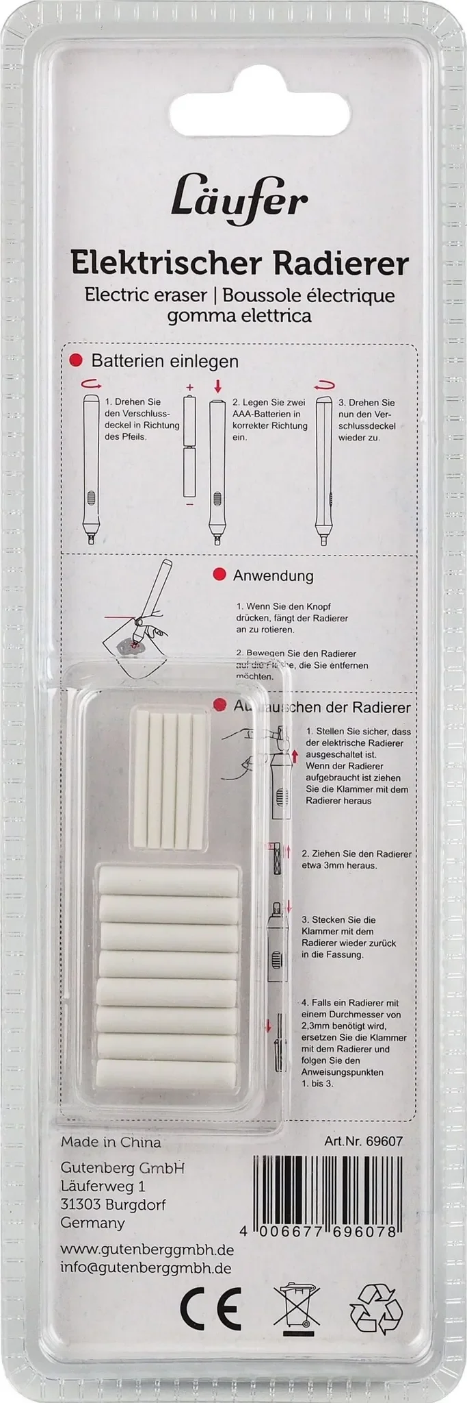 | Lieferumfang | 1 elektrischer Radierer, 1 Metall-Wechselspitze (5 mm), 2 Kunststoff-Wechselspitzen (2,3 mm), 13 große Radierer Ø 5 mm, 10 kleine Radierer Ø 2,3 mm |