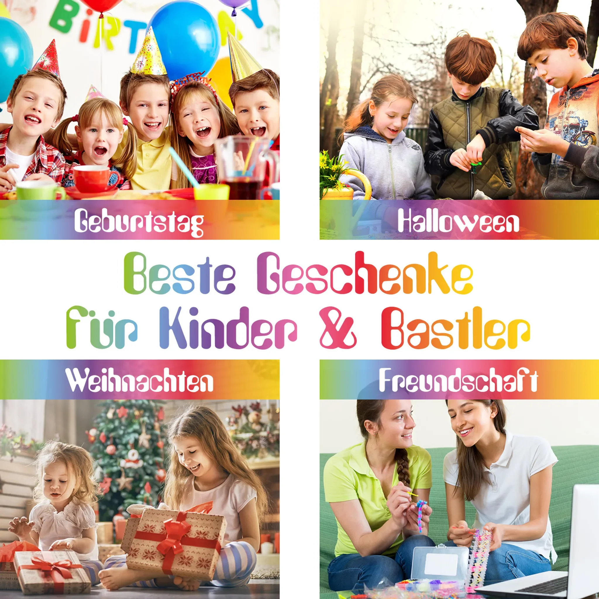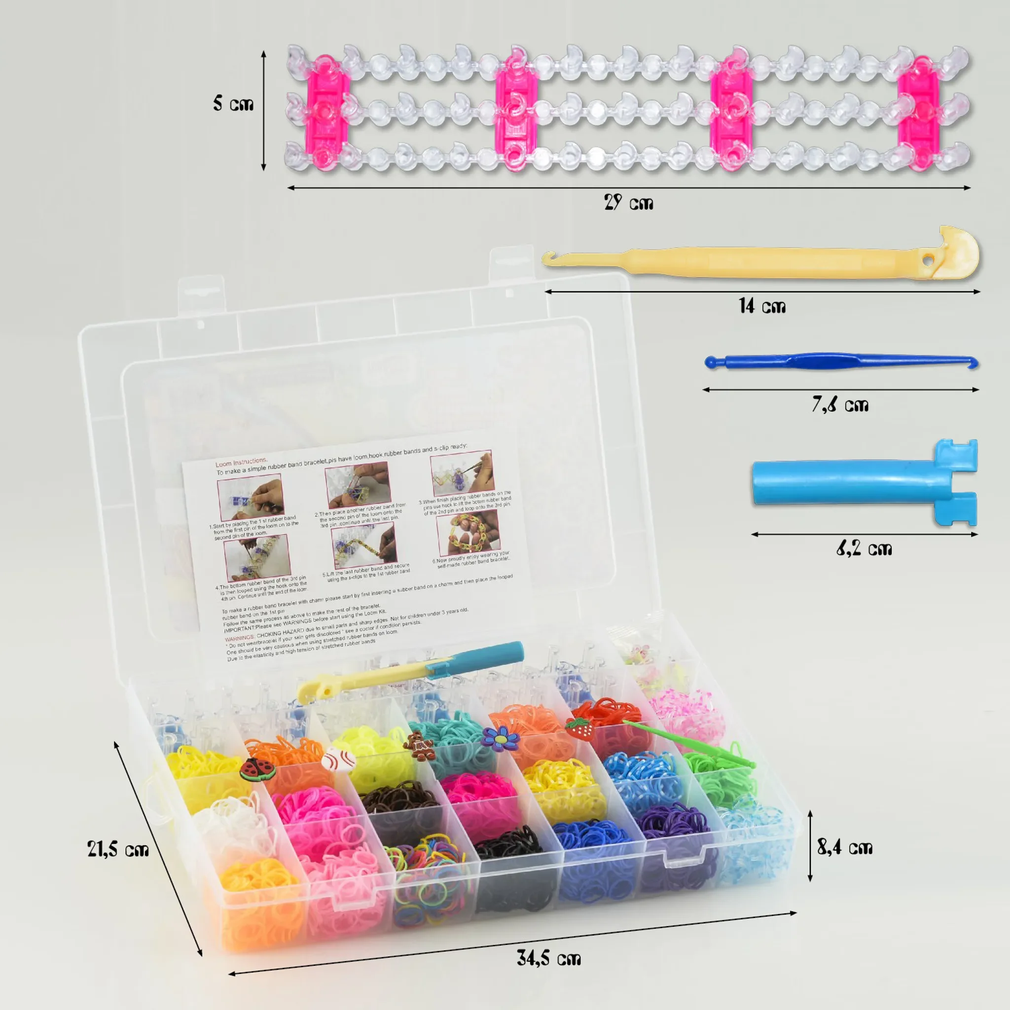 | Im Paket | 4.200 Loom-Bands, Webrahmen, Häkelnadeln, S-Clips, Sortierbox, Anleitung |