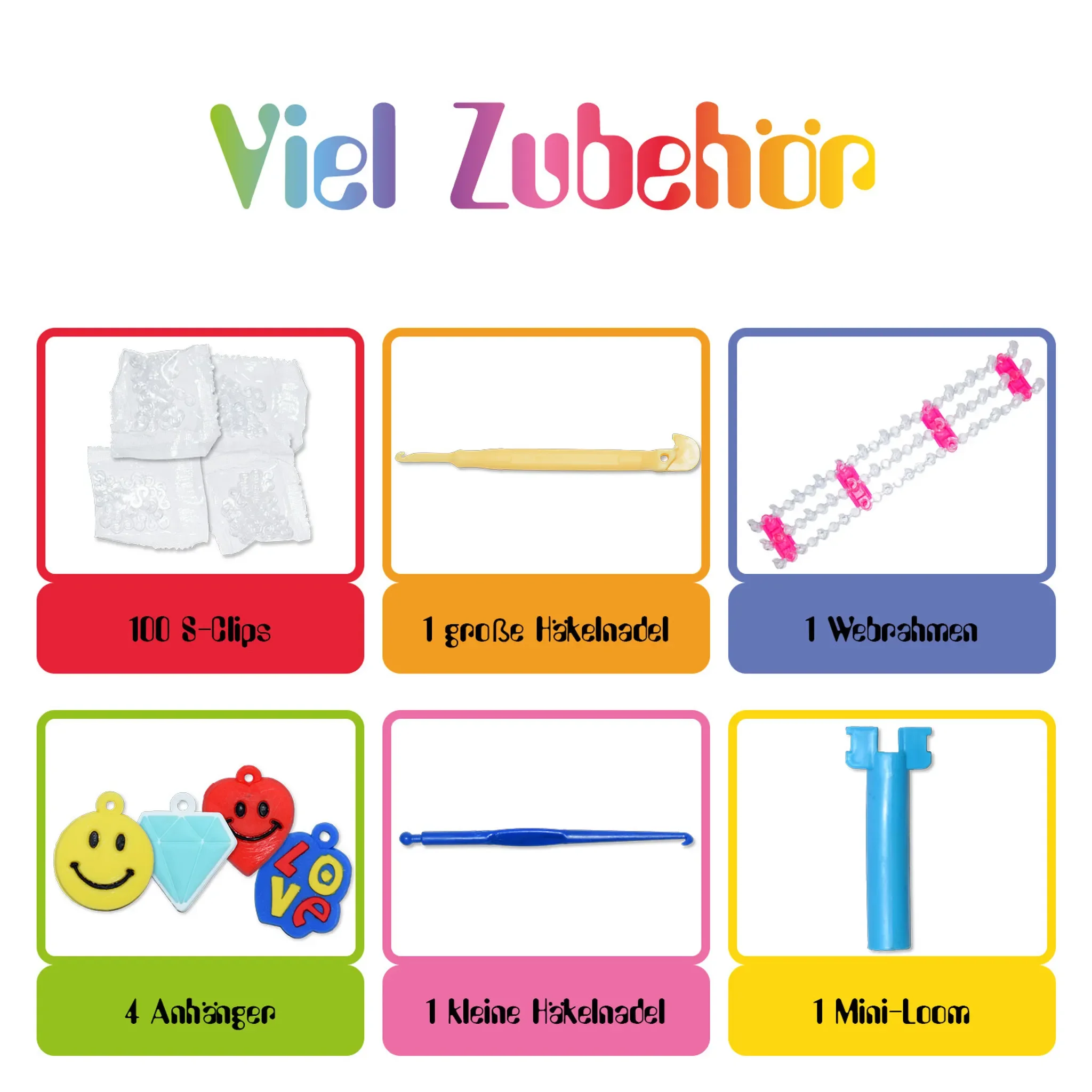 | Zubehör | Webrahmen, große & kleine Häkelnadel, S-Clips |
