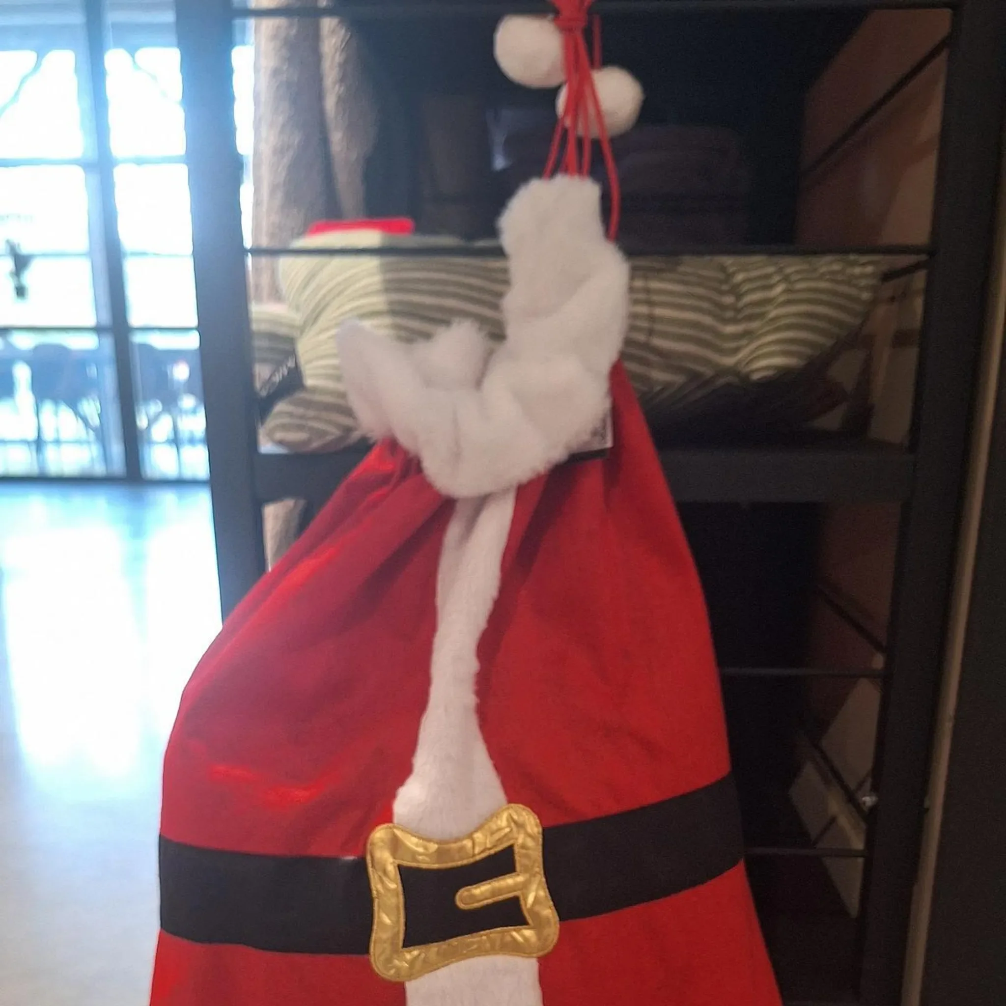 Highlights: Festliches Santa-Design, praktischer Kordelzug mit Pompons, vielseitig einsetzbar für Geschenke und Dekoration, wiederverwendbar.