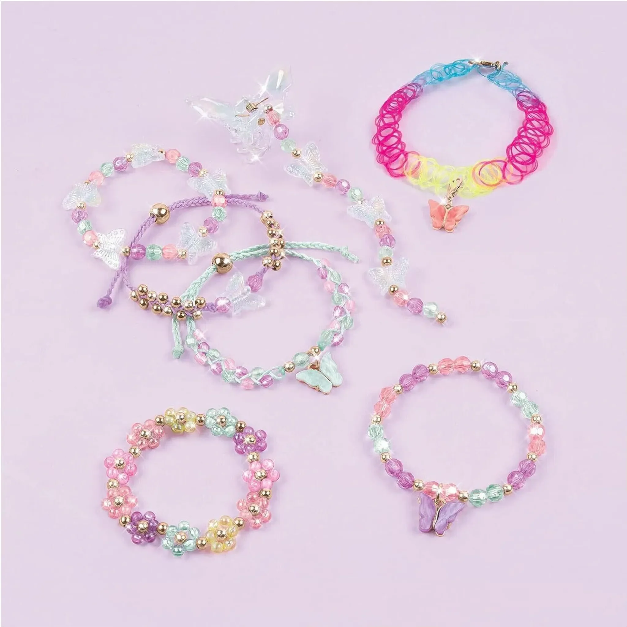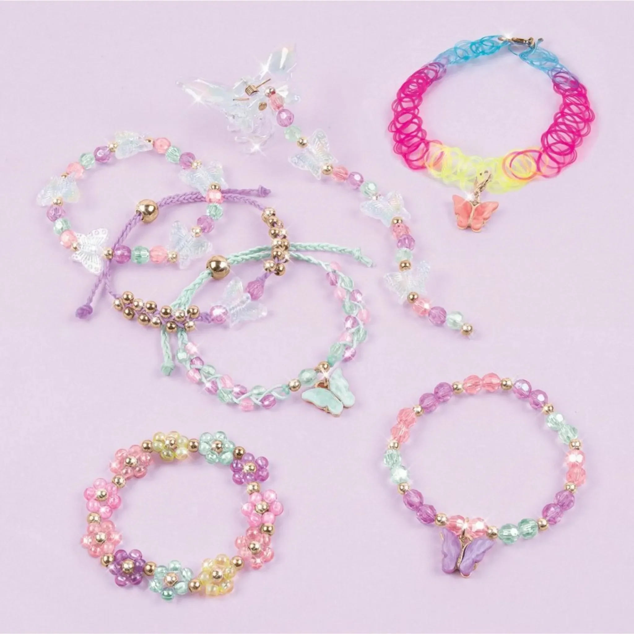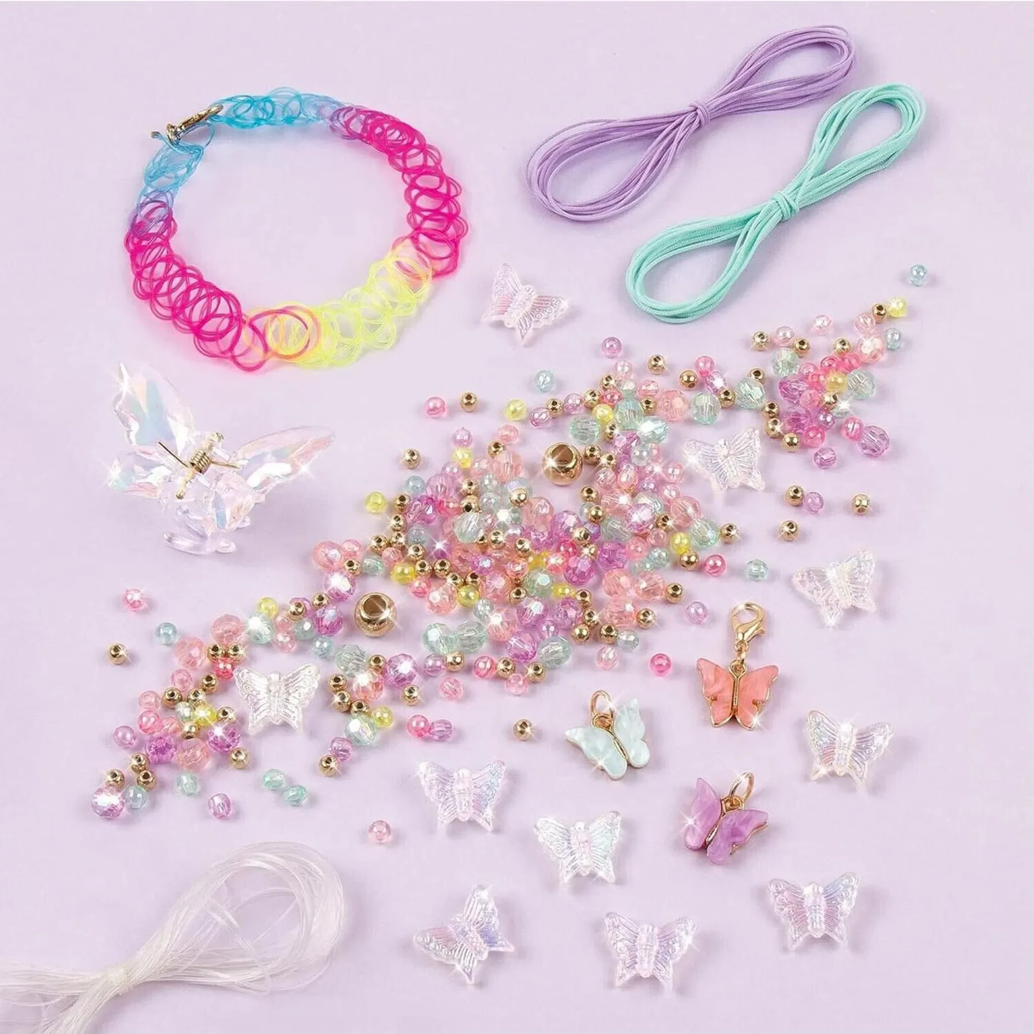 Mit über 270 Perlen, farbigen Kordeln, Anhängern in Schmetterlingsform und vielem mehr, können Kinder ihre eigenen Armbänder und Schmuckstücke individuell gestalten. Die beiliegende Anleitung hilft dabei, den kreativen Prozess zu beginnen und sorgt für stundenlangen Bastelspaß.